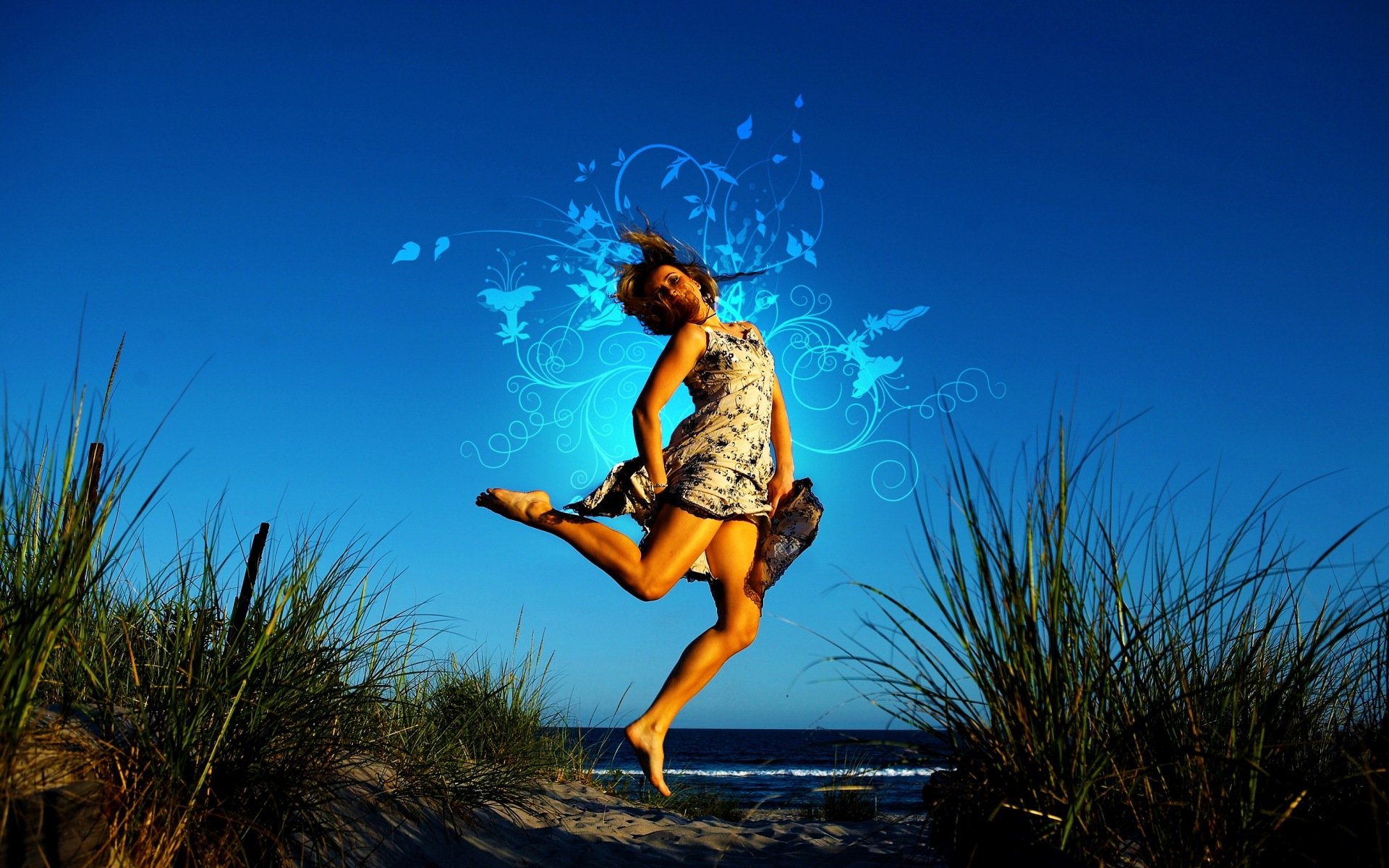 La modelo louise maria en un vestido corto azul y zapatos de tacón alto en una pose seductora en un sofá de cueroLa modelo Louise Maria en un vestido corto azul y zapatos de tacón alto en una pose seductora en un Sofá de cuero