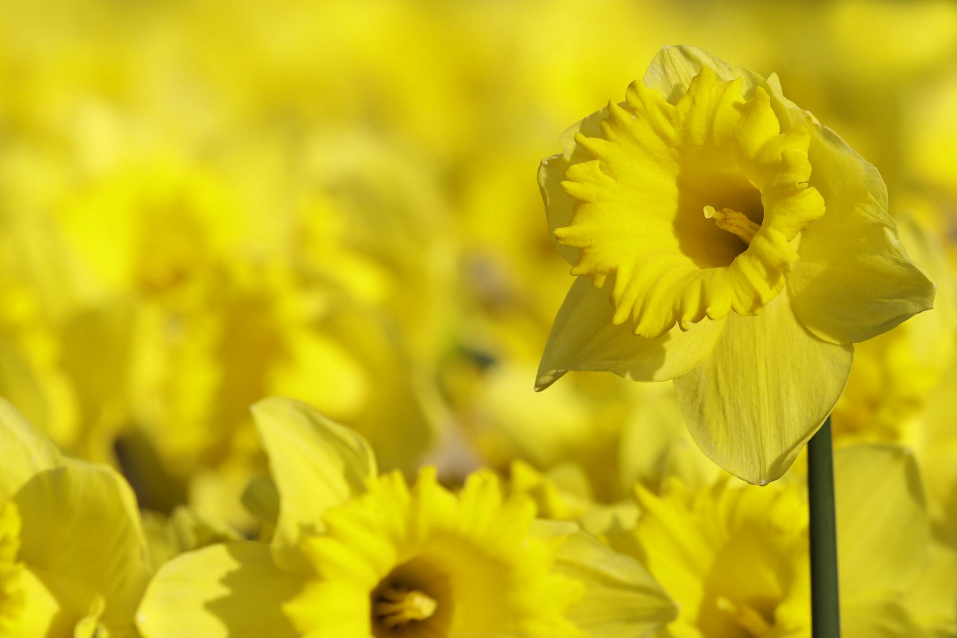 Narcisos blancos y amarillos. Hojas verdes jugosas