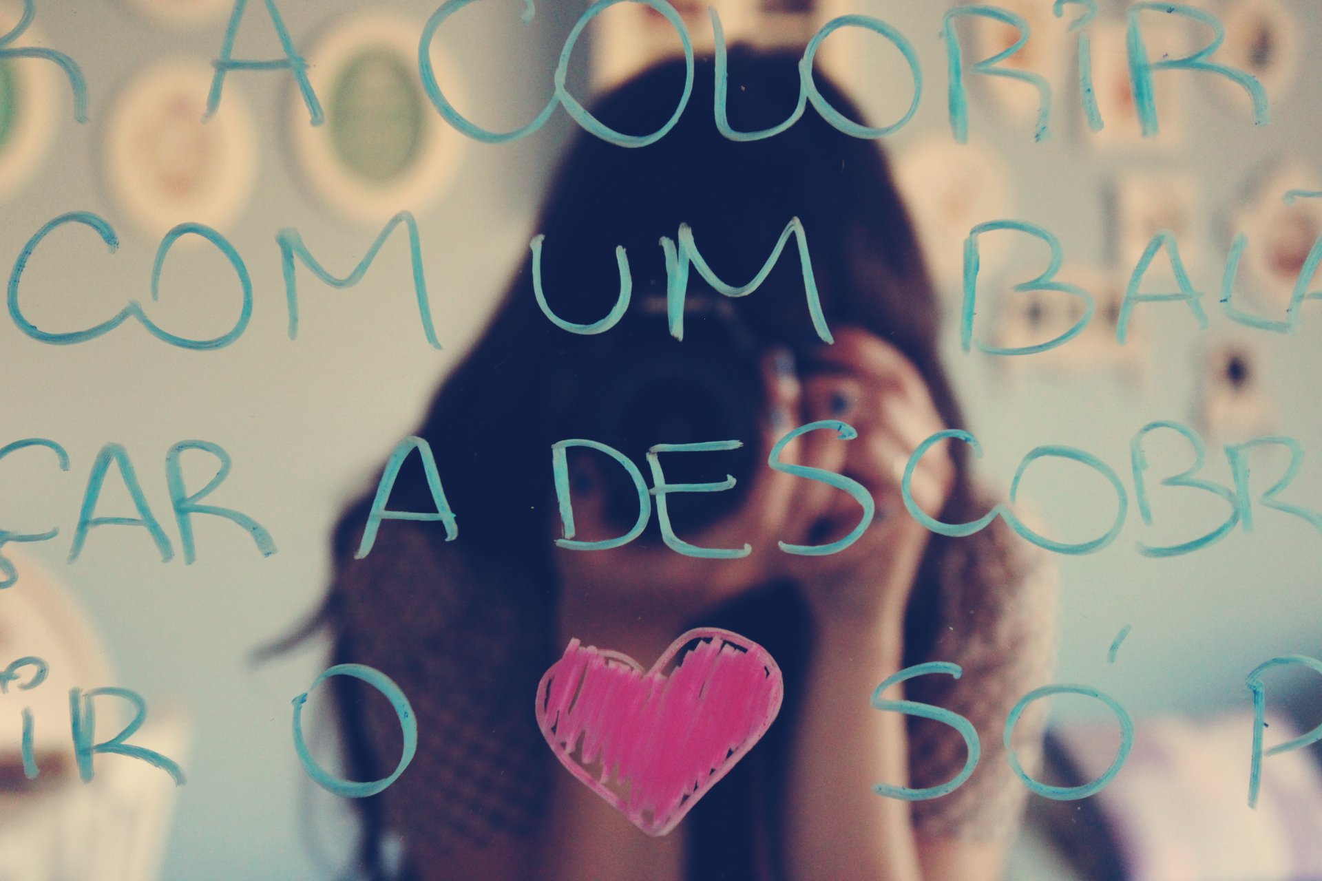 Una chica morena se fotografía en un espejo con una declaración de amor