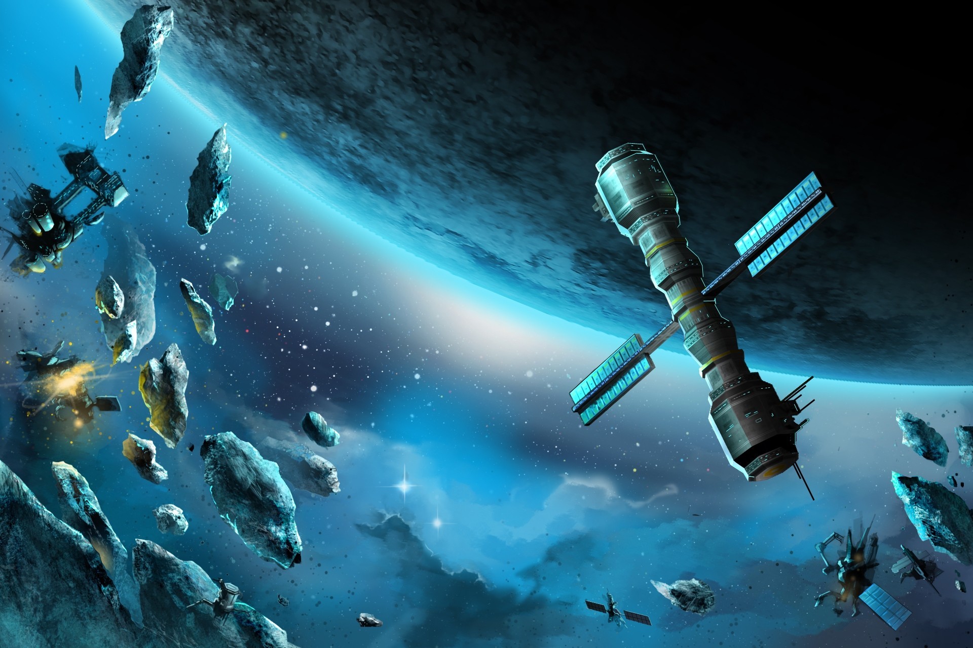 Satélite espacial cerca de un planeta cerca de asteroidesSatélite espacial cerca de un planeta cerca de asteroides