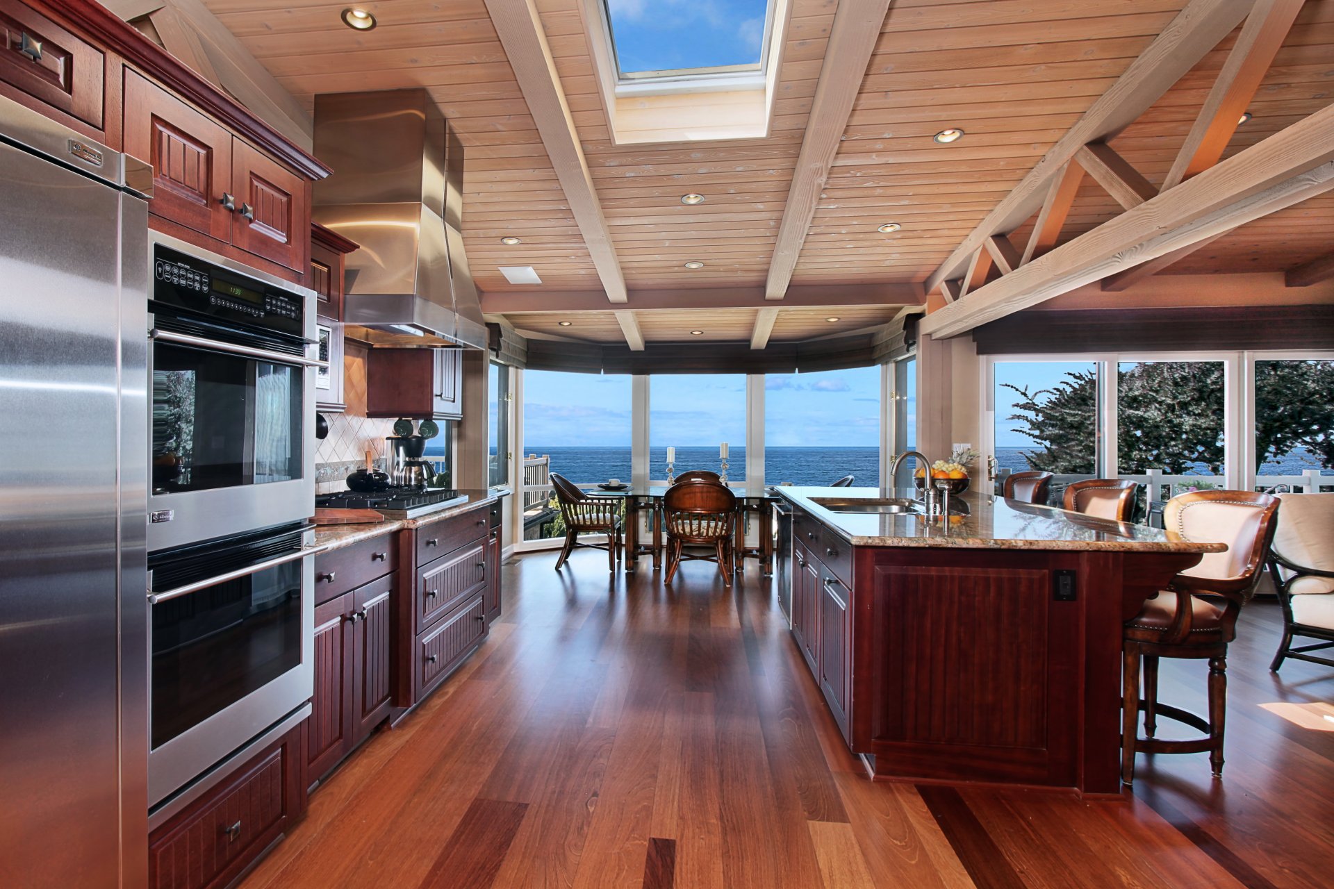 Pequeño restaurante moderno con cocina abierta y mesas de madera para los huéspedesPequeño Restaurante moderno con cocina abierta y mesas de madera para los huéspedes