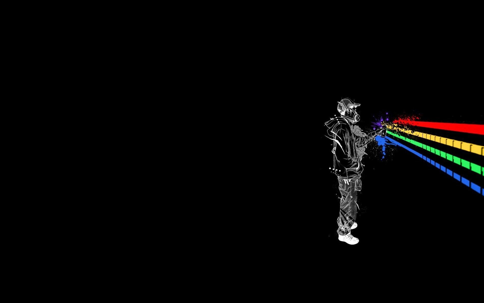 Hombre dibujando líneas del arco iris sobre un fondo negroHombre dibujando líneas del arco iris sobre un fondo negro