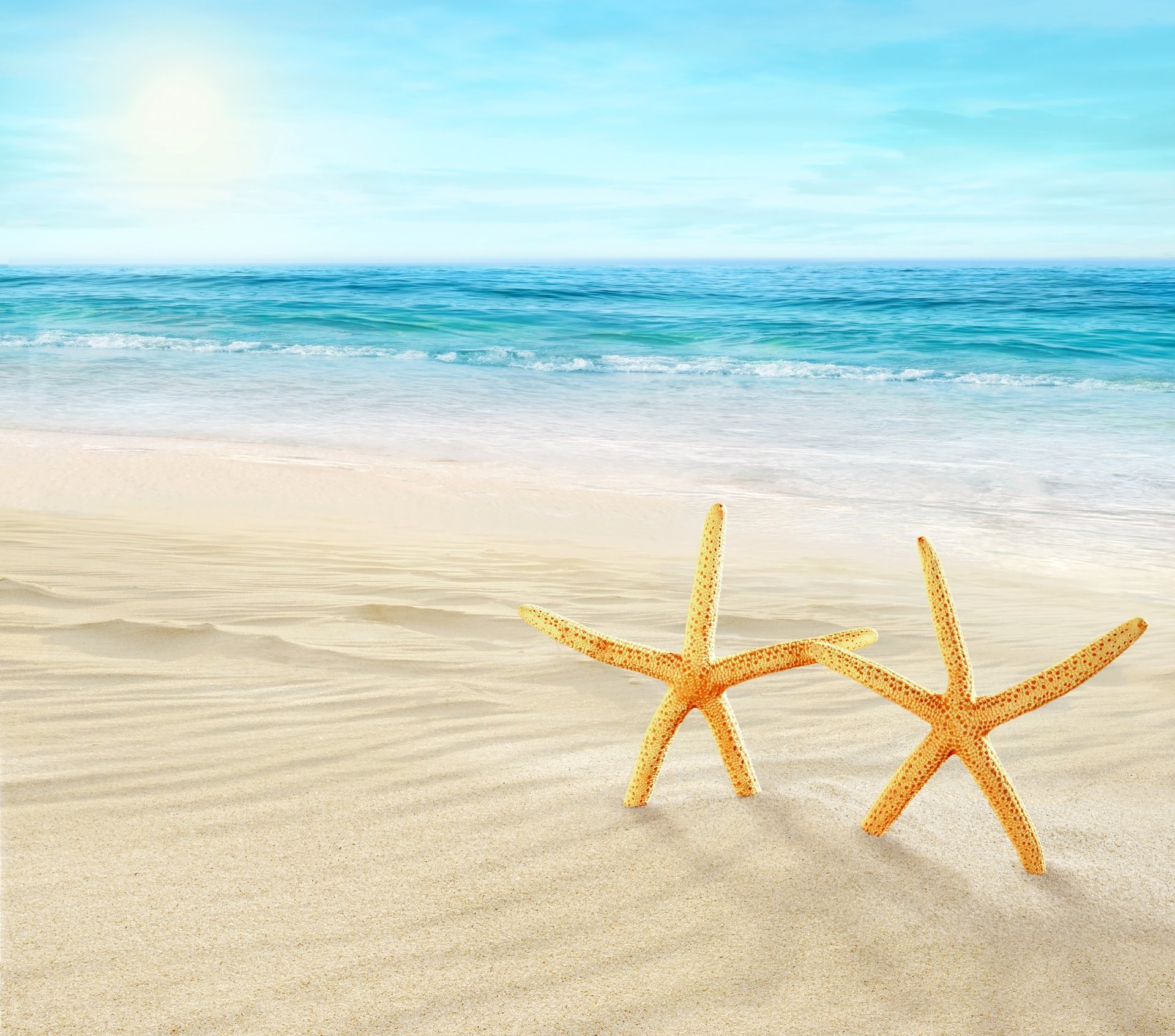 Estrellas de mar junto al mar en una playa blanca como la nieveEstrellas de mar junto al mar en una playa blanca como la nieve