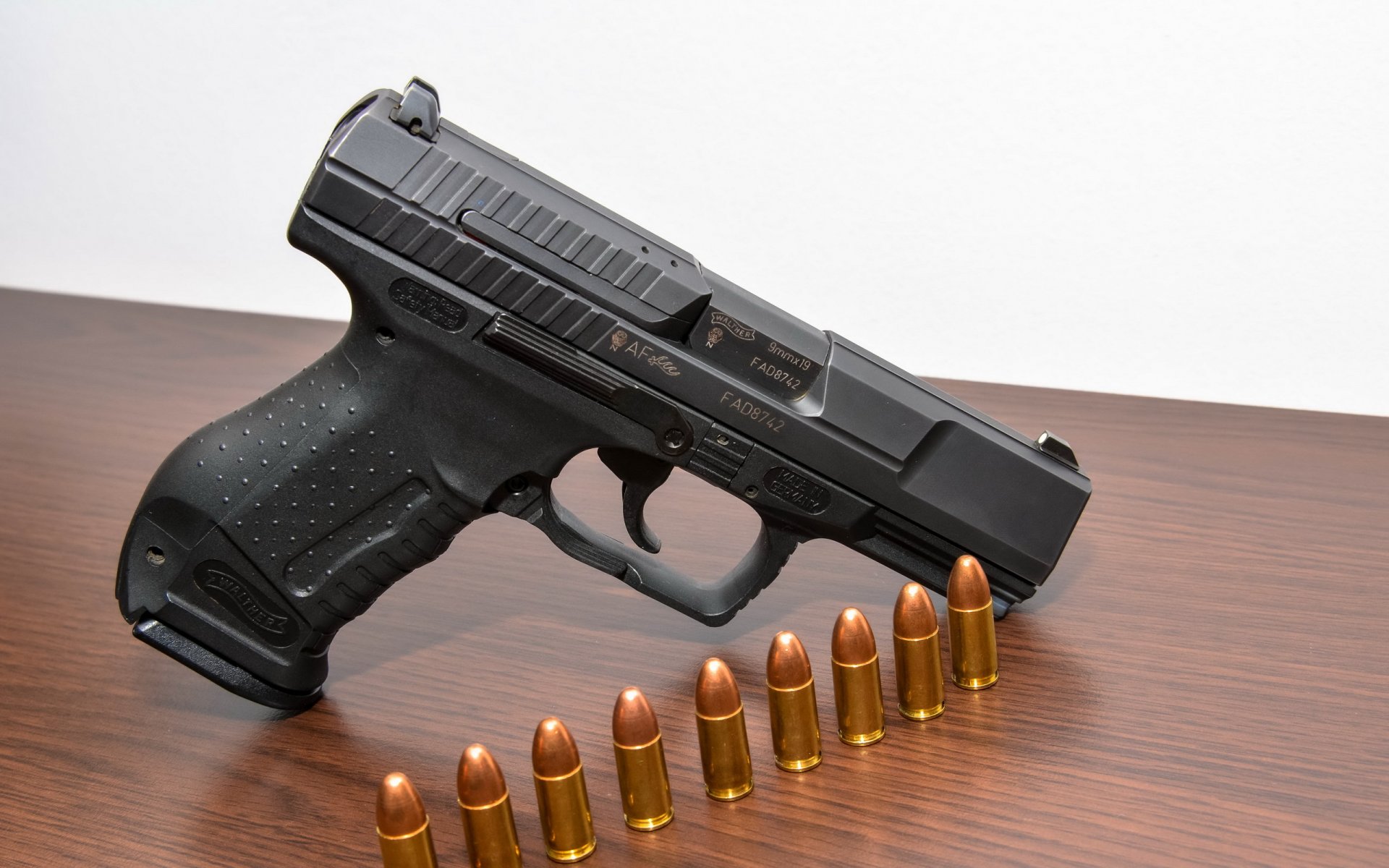 El arma está sobre la mesa. pistolas de metal brillanteEl arma está sobre la mesa. Pistolas de metal brillante