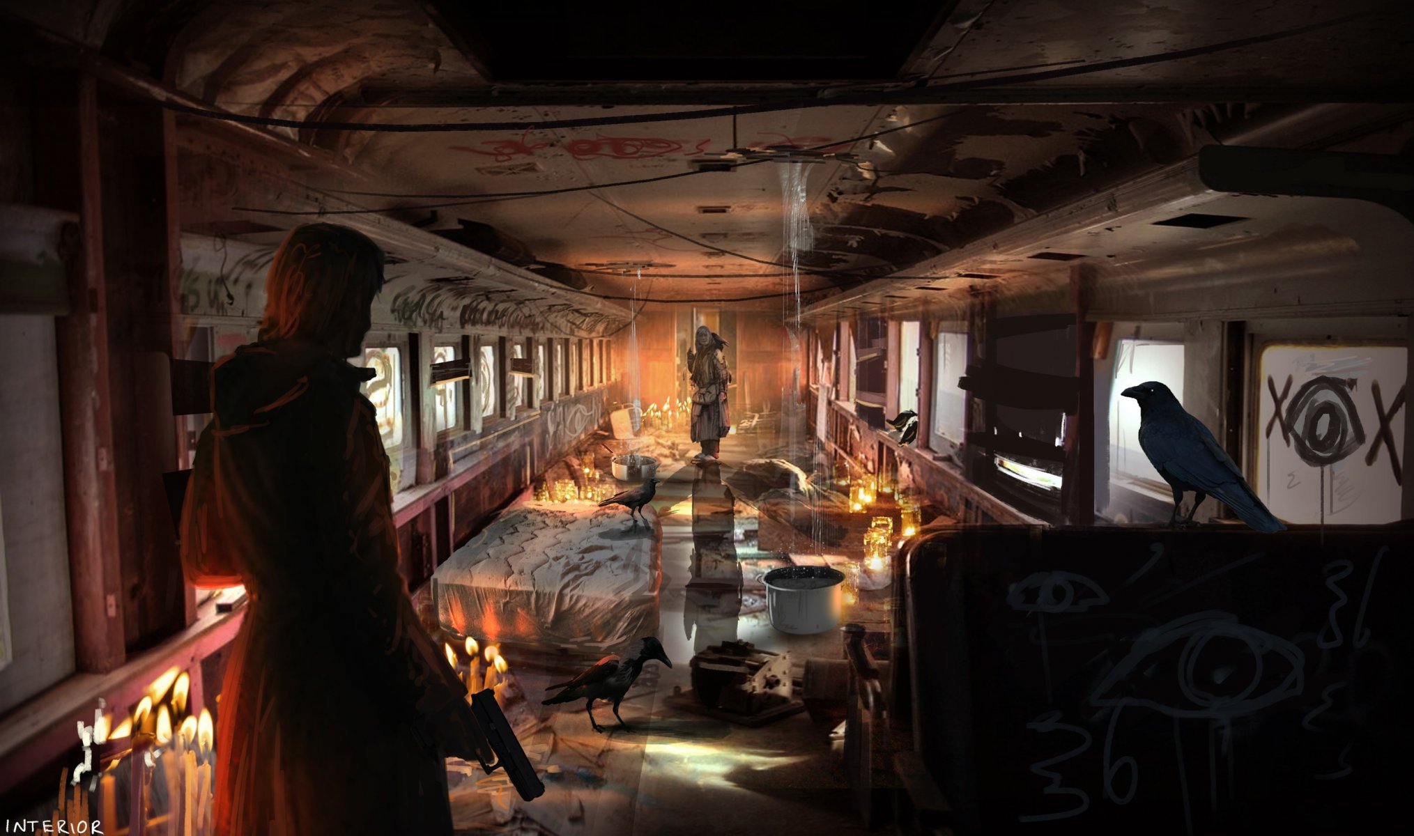 Un hombre con una pistola en una casa a la luz de las velas contra un fondo de cuervos y pájaros