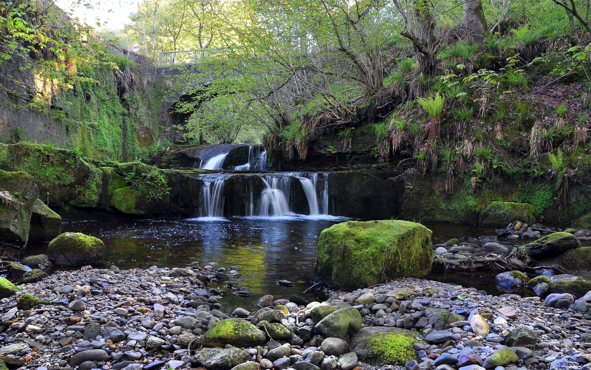 Una pequeña cascada en la que flotan las hojas de otoñoUna pequeña cascada en la que flotan las hojas de otoño