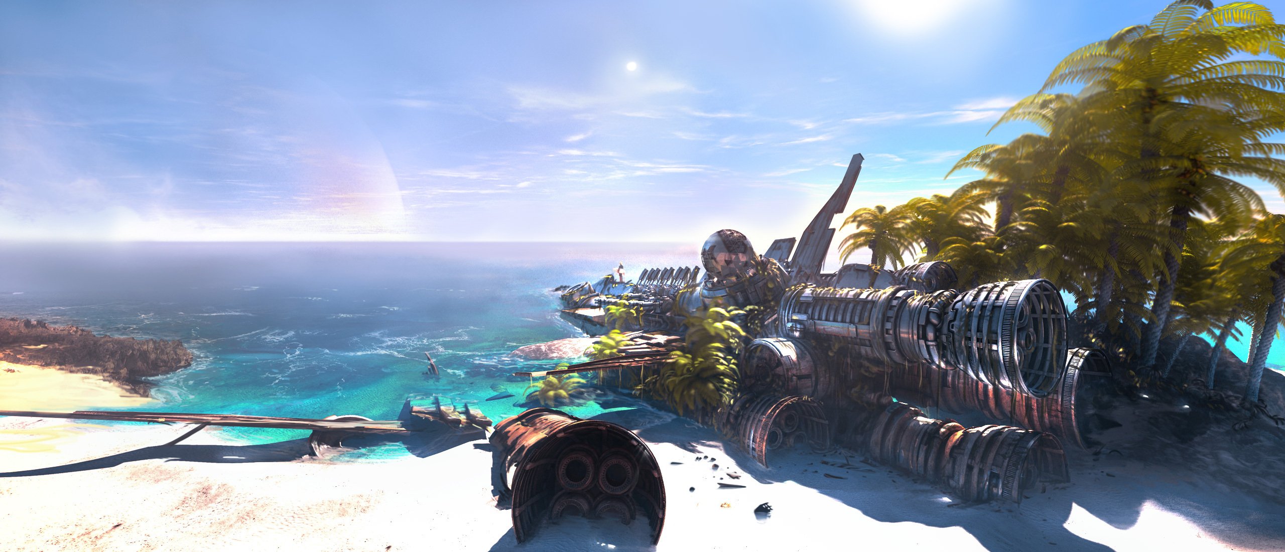 El arte de la nave espacial se estrella en el fondo de un mar tranquilo y una costa de arenaEl arte de la nave espacial se estrella en el fondo de un mar tranquilo y una costa de arena