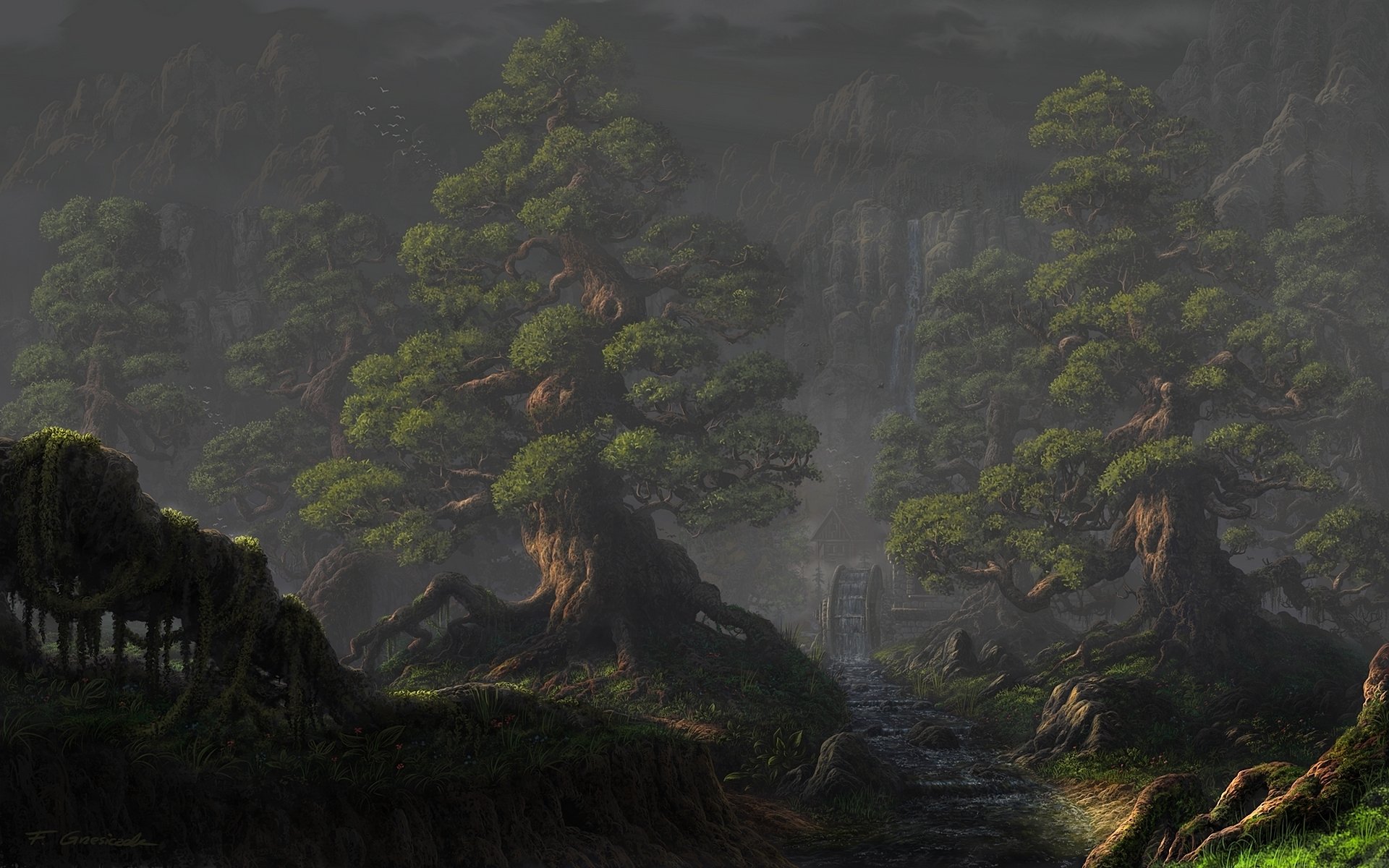 Arte paisaje árboles junto a un arroyo en el fondo de las montañasArte paisaje árboles junto a un arroyo en el fondo de las montañas