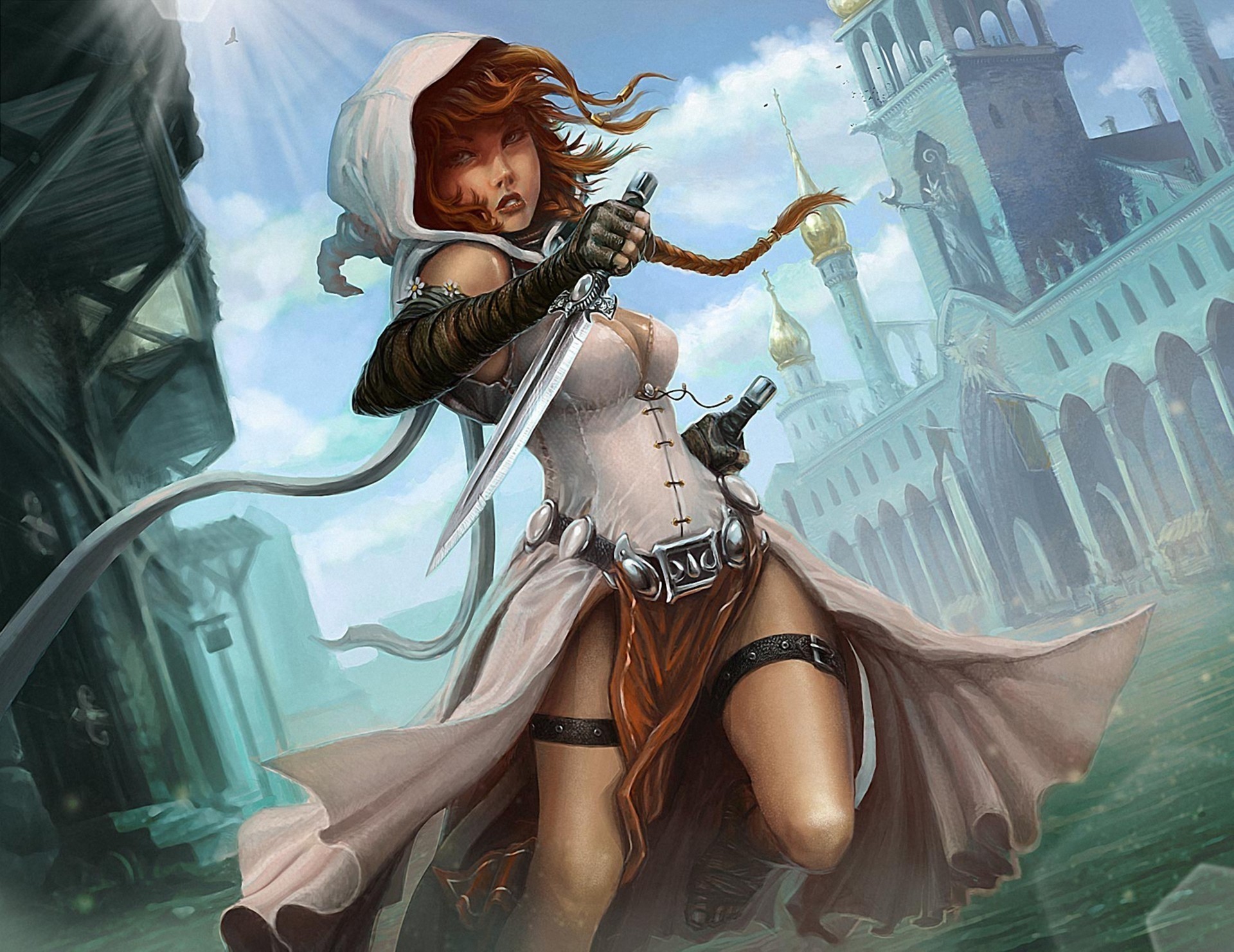 Arte: una chica asesina con un cuchillo y una víctima en la lluvia