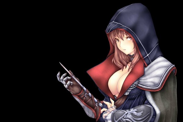 Chica encapuchada con un cuchillo sobre un fondo negroChica encapuchada con un cuchillo sobre un fondo negro