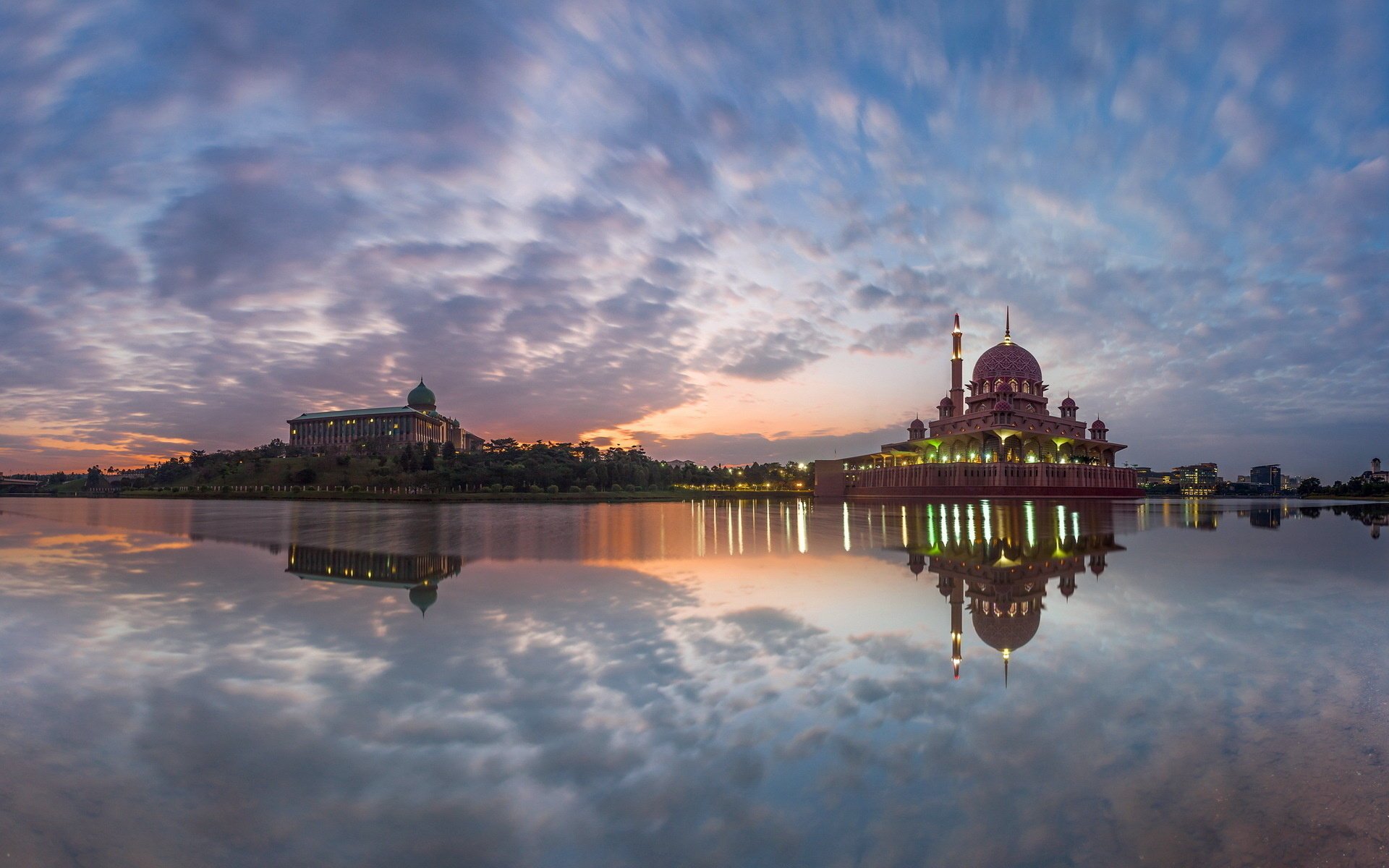 Reflejo de nubes en el agua al atardecer en la ciudadReflejo de nubes en el agua al atardecer en la ciudad