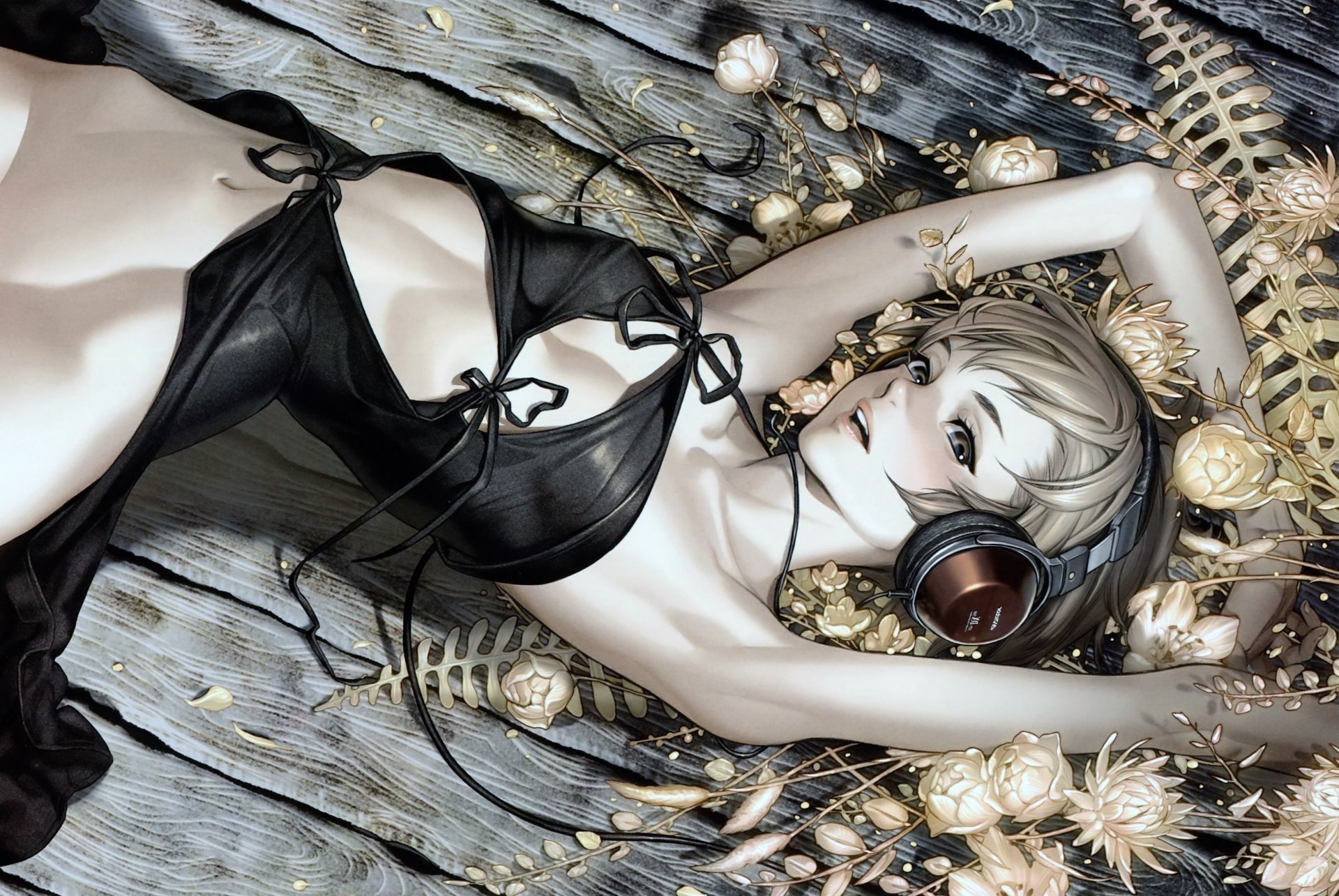 Chica en el suelo con auriculares entre las floresChica en el Suelo con auriculares entre las flores