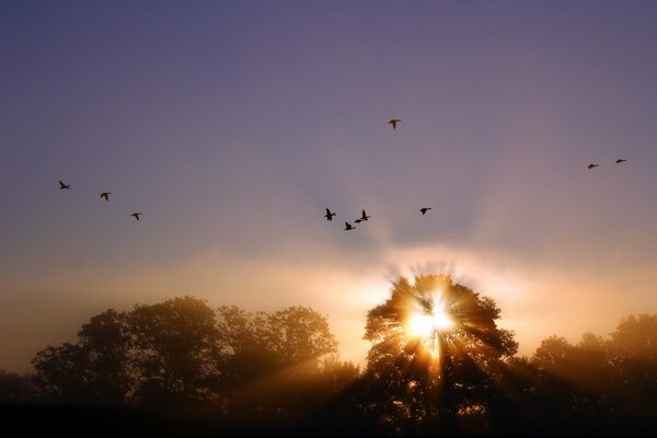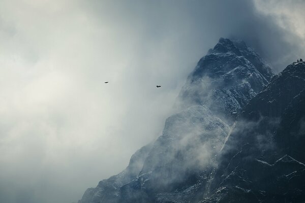 Montañas del Himalaya en la nieve con aves voladoras en las nubes