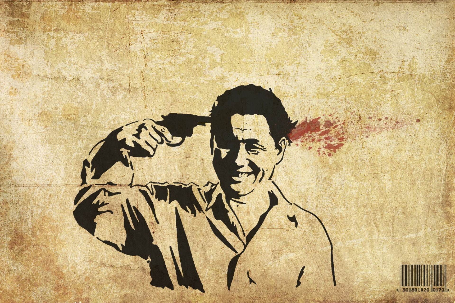 Dibujo de un hombre sonriente que se suicida con una pistola y un código de barrasDibujo de un hombre sonriente que se suicida con una pistola y un código de barras