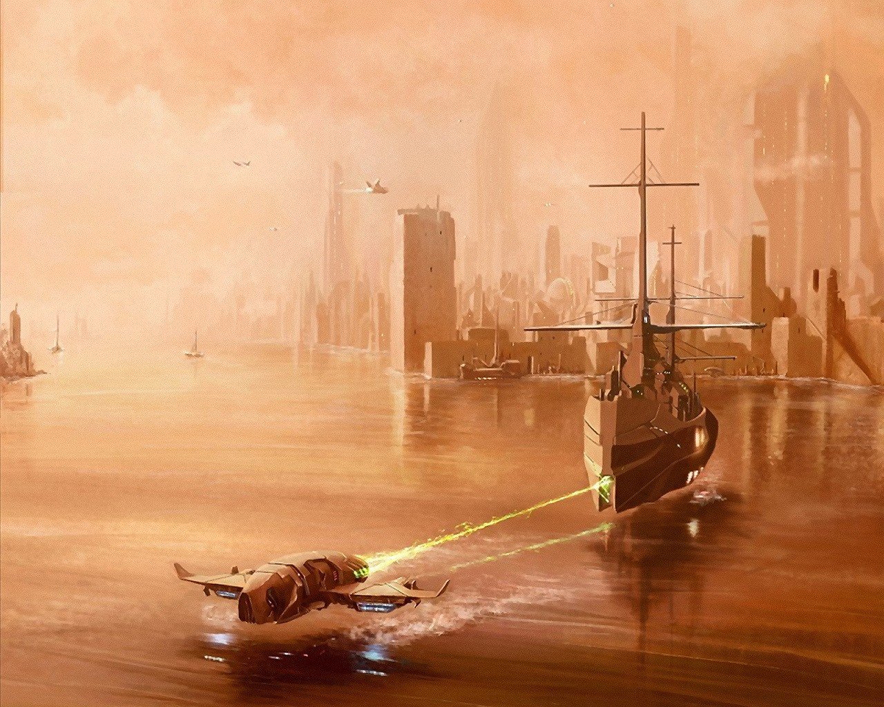 Lara croft con un arpón en el agua entre los tiburones en el fondo de un barcoLara Croft con un arpón en el agua entre los tiburones en el fondo de un barco