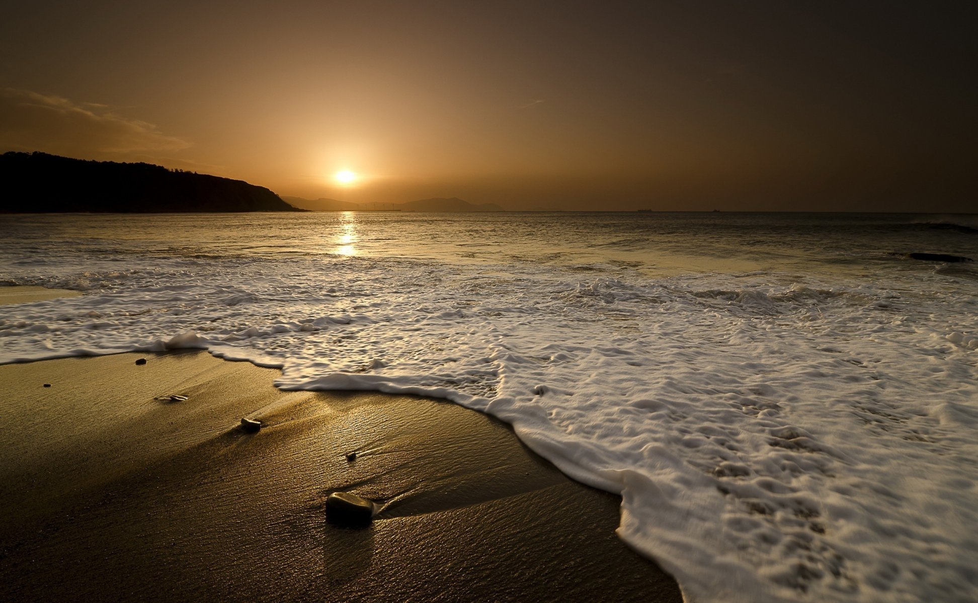 Puesta de sol rosa en la niebla del mar entre las rocas