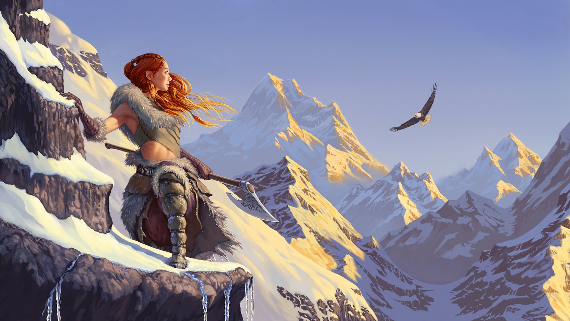 Pelirroja chica con un hacha en las montañas nevadasPelirroja chica con un hacha en las montañas nevadas