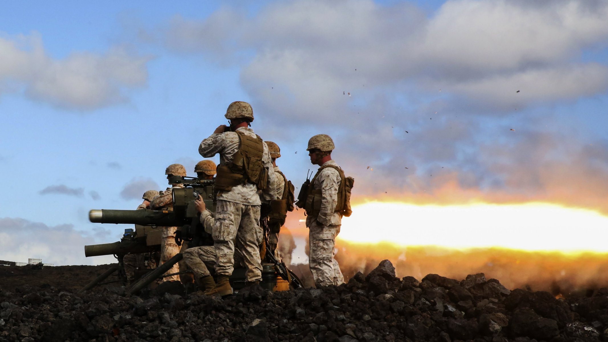 Un soldado al lado de un coche que lanza un coheteUn soldado al lado de un coche que lanza un cohete