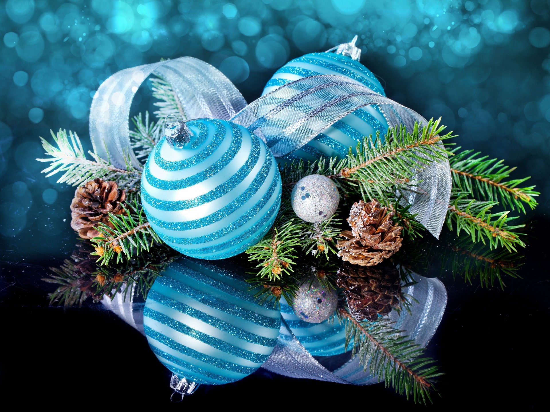 Rama de árbol de navidad decorada con cinta y bola de color azulRama de árbol de Navidad decorada con cinta y bola de color azul