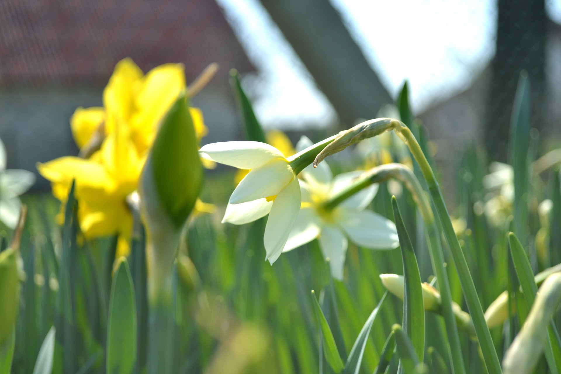 Narcisos blancos y amarillos. hojas verdes jugosasNarcisos blancos y amarillos. Hojas verdes jugosas