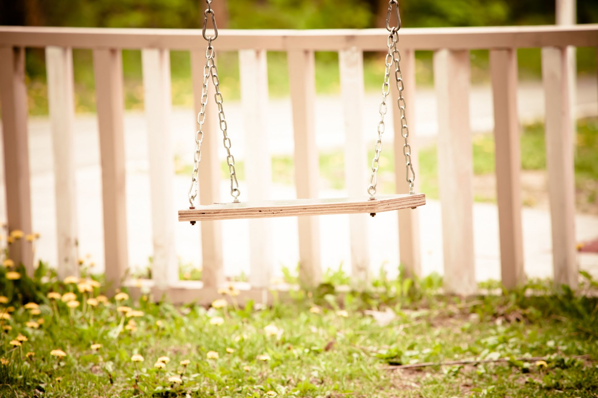 Columpio en una cadena contra un fondo de hierba verdeColumpio en una cadena contra un fondo de hierba verde