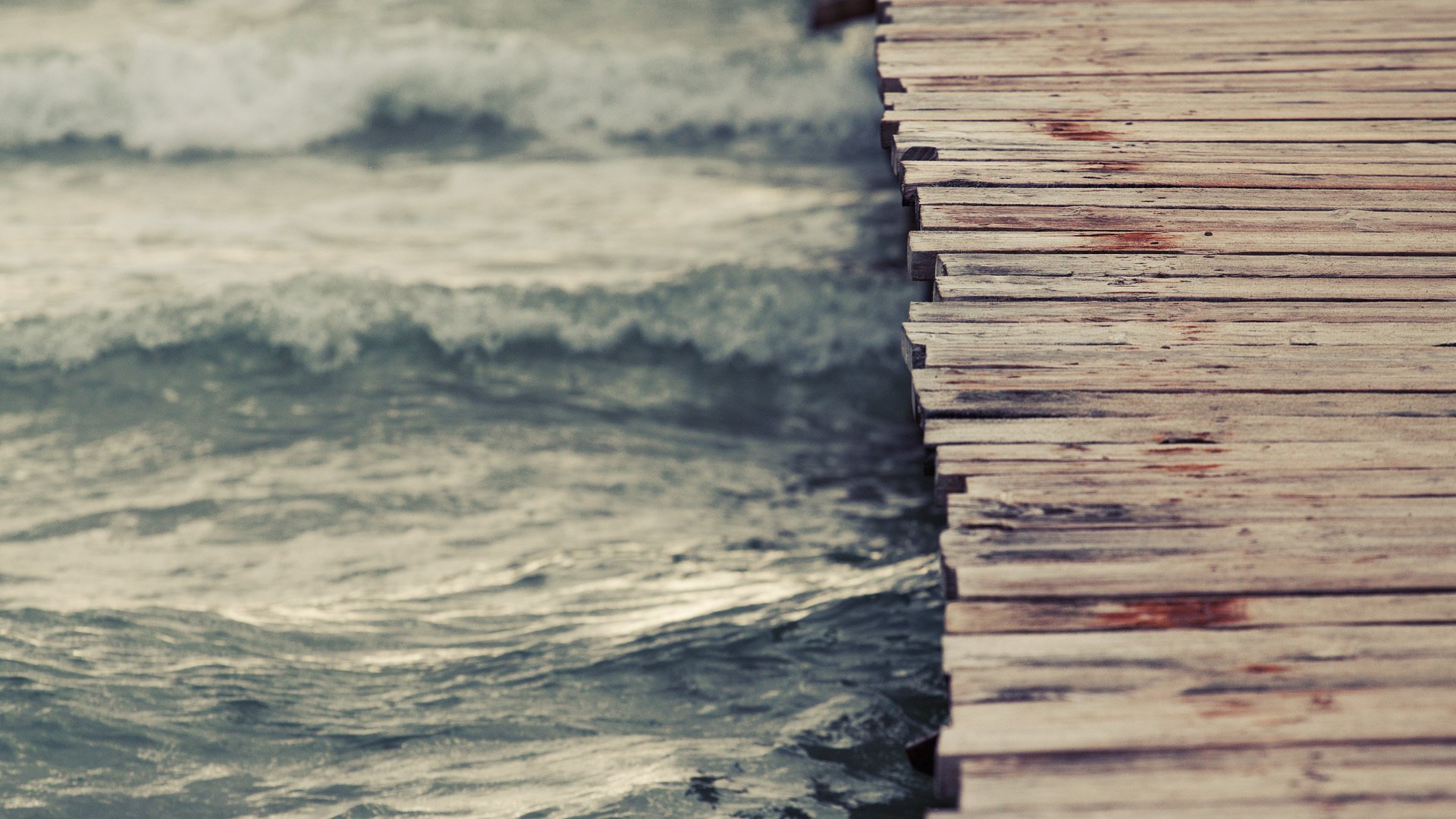 Las olas de agua fría se balancean bajo una plataforma de maderaLas olas de agua fría se balancean bajo una plataforma de madera