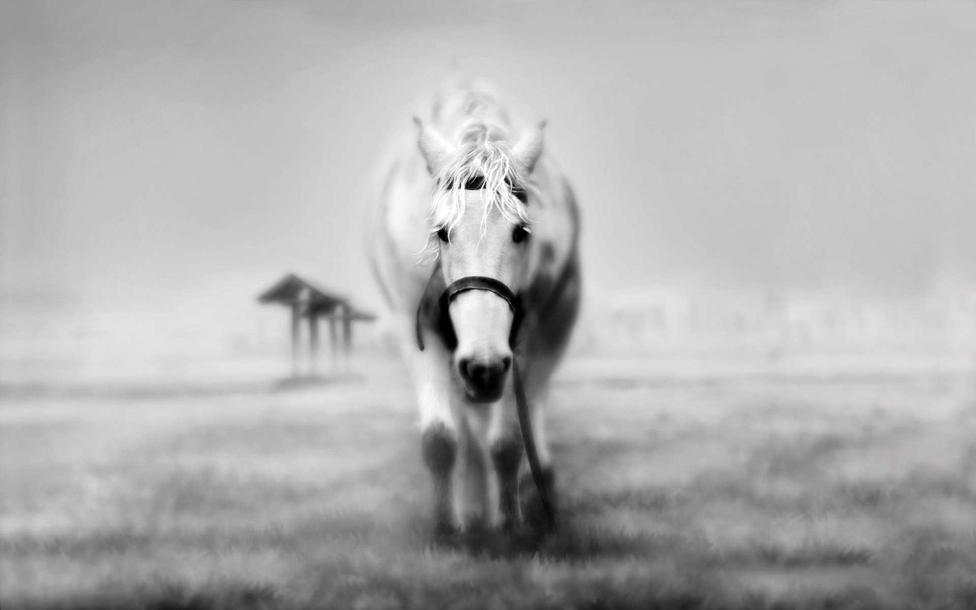 Caballo gris en el campo. Fondo monocromático