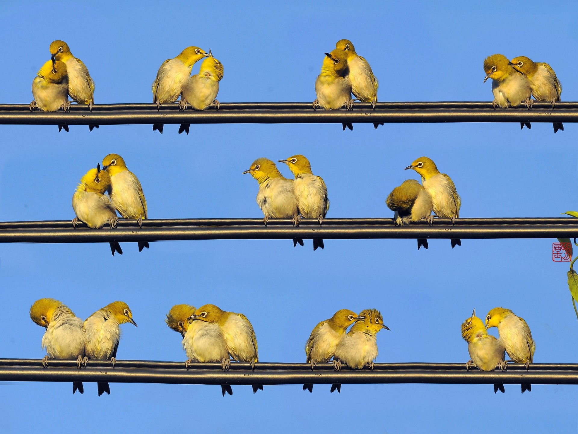 Cuervos sentados en cables contra un cielo lluviosoCuervos sentados en cables contra un cielo lluvioso