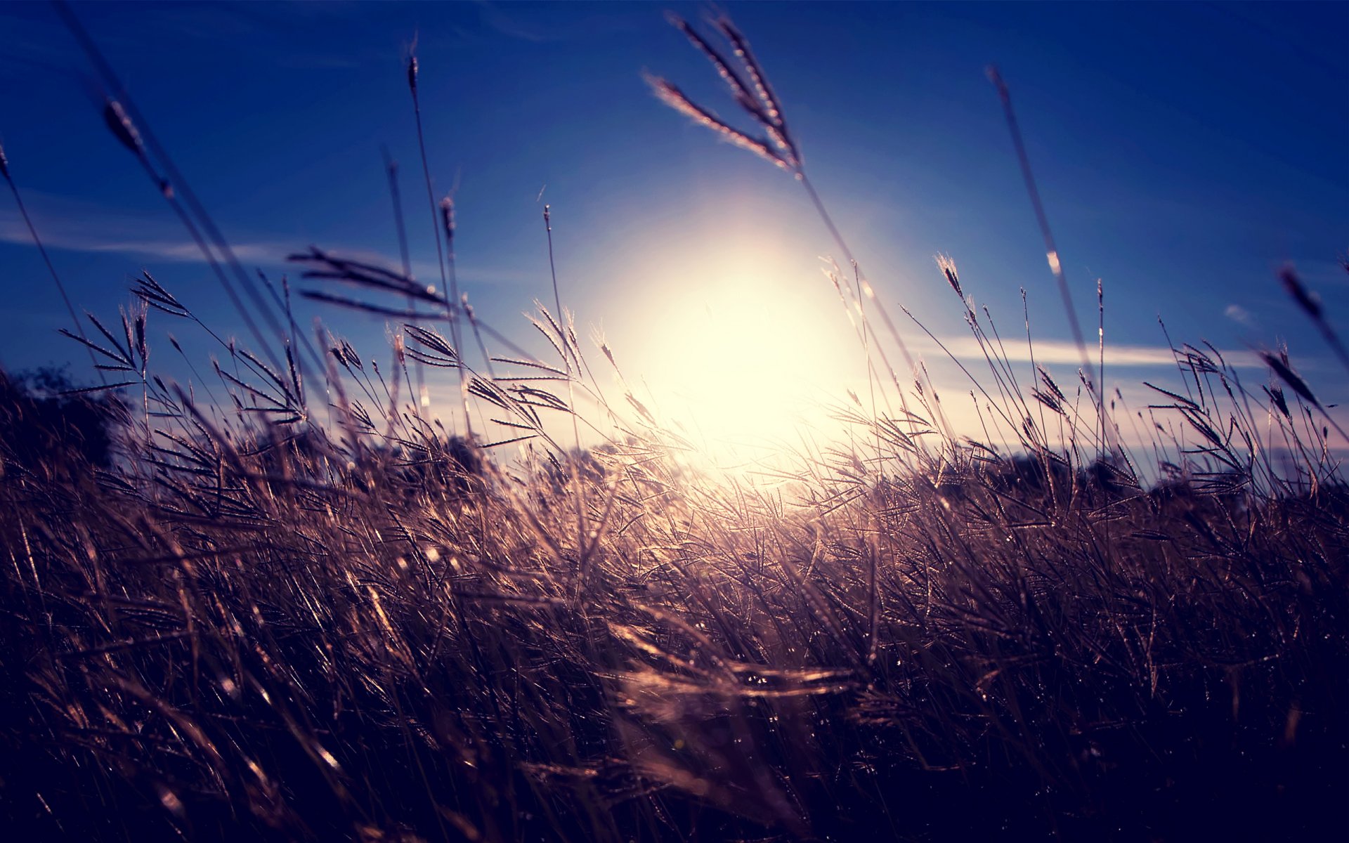 Puesta de sol en un campo de hierba seca contra el cielo azulPuesta de sol en un campo de hierba seca contra el cielo azul