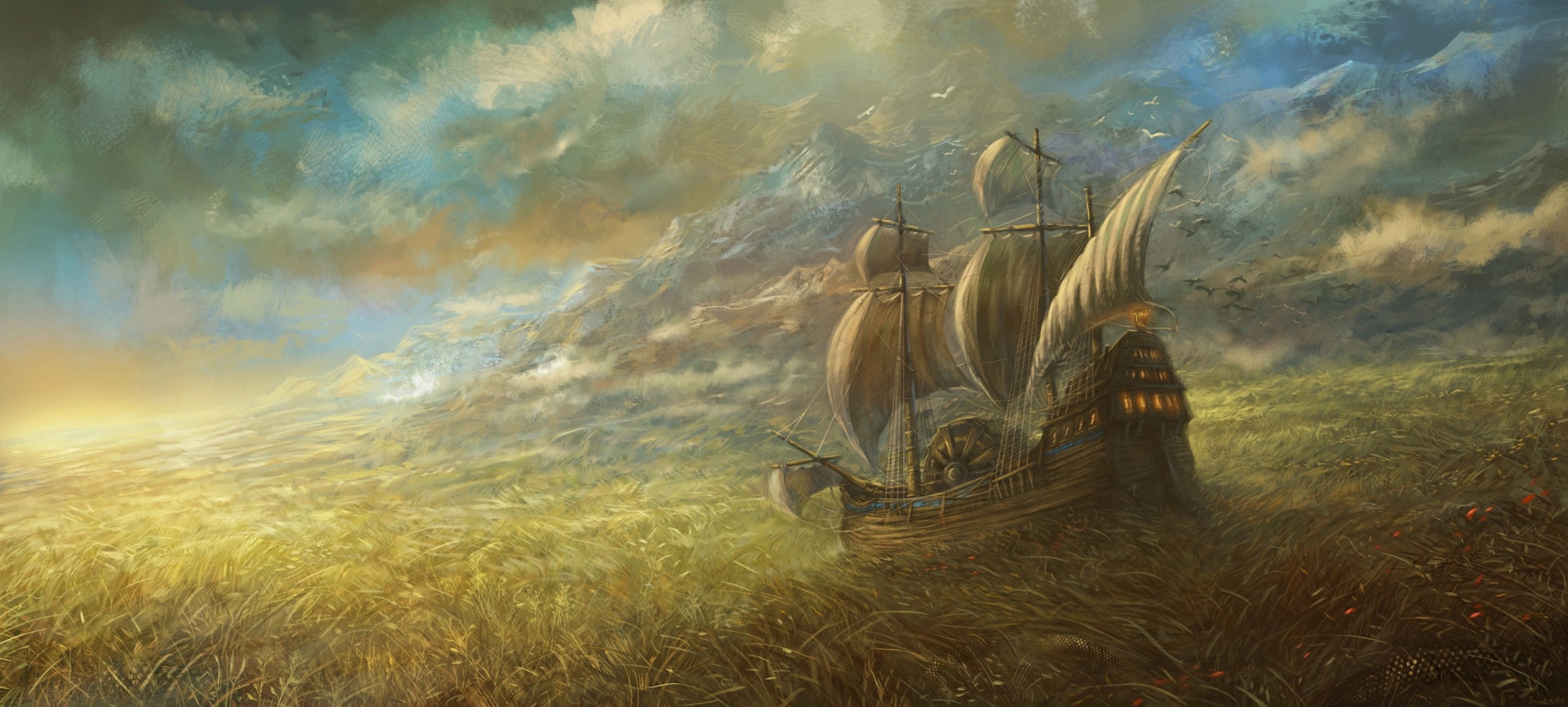 Camino de tierra a través de un campo de hierba amarilla, ogros en el horizonte, cielo con nubesCamino de tierra a través de un campo de hierba amarilla, ogros en el horizonte, cielo con nubes