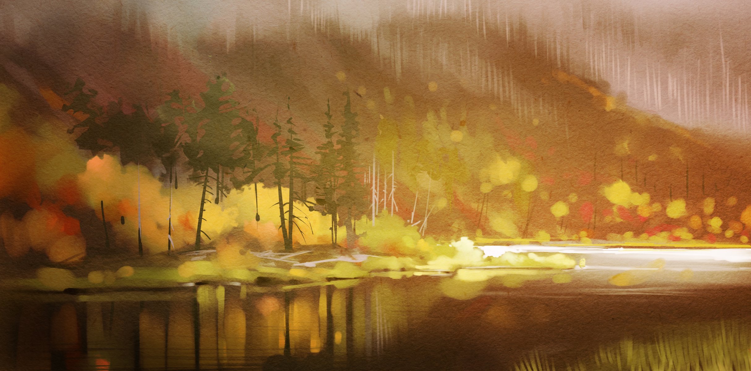 Arte del bosque de otoño en la orilla del río