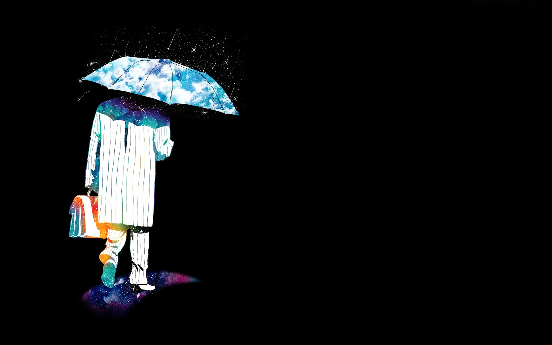 Hombre con una capa bajo un paraguas con una maletaHombre con una capa bajo un paraguas con una maleta
