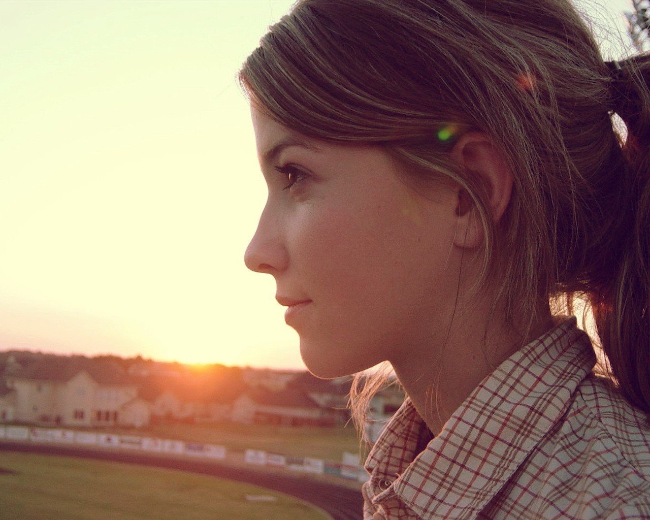 Perfil de la chica en el fondo de la puesta de sol