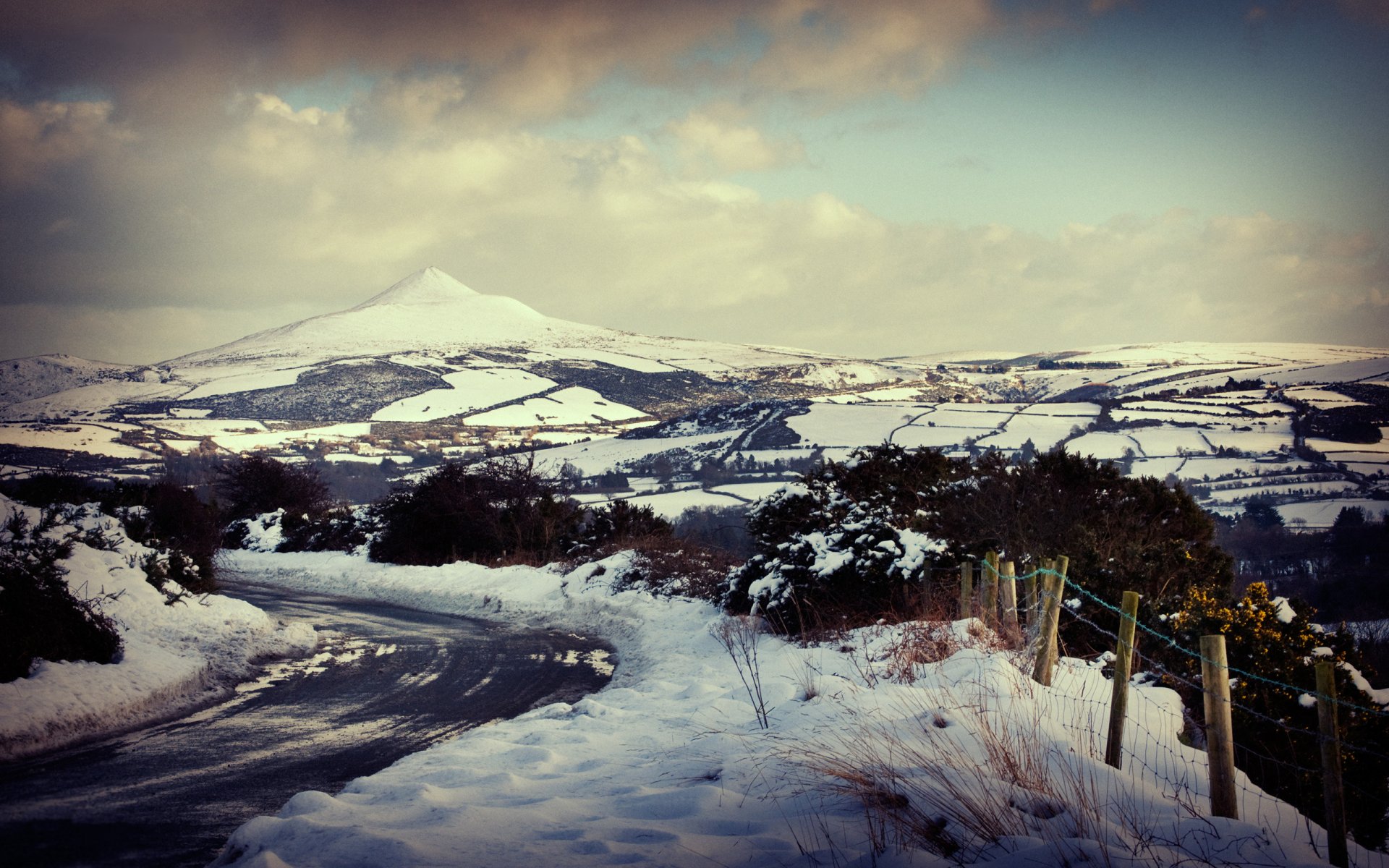 Paisaje de la carretera de invierno con vistas a la montañaPaisaje de la carretera de invierno con vistas a la montaña