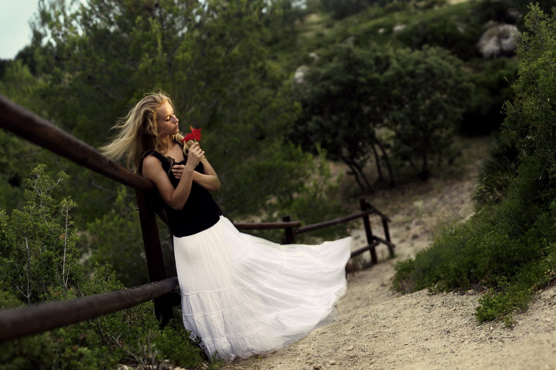 Chica en una falda de aire blanco con una flor roja en sus manos