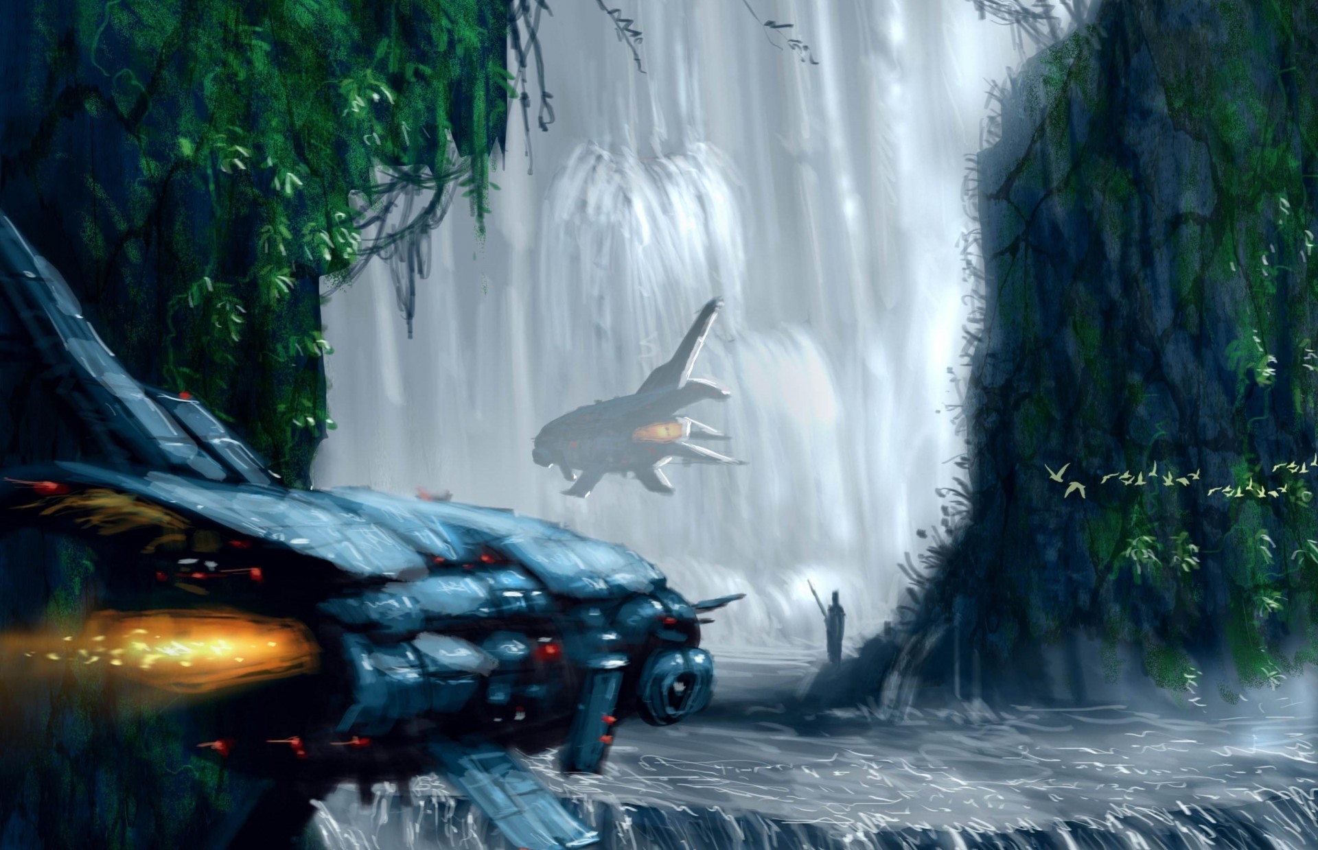 Nave espacial en el fondo de una cascada