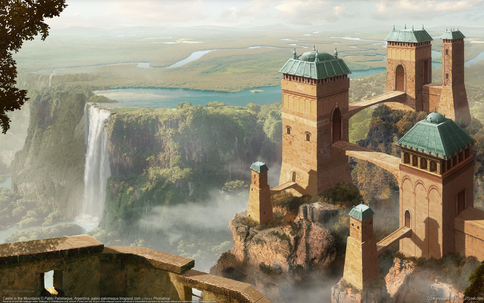 Castillo antiguo en el fondo de una cascada empinada