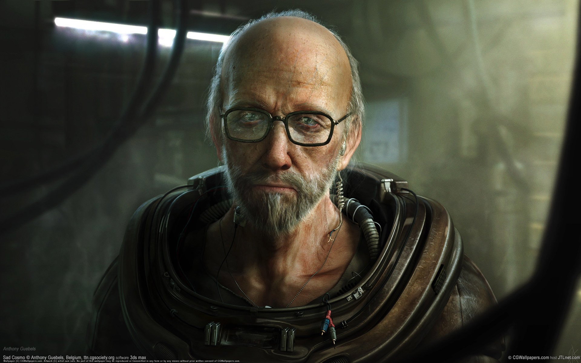Viejo astronauta triste con traje espacial sin casco y gafasViejo astronauta triste con traje espacial sin casco y gafas