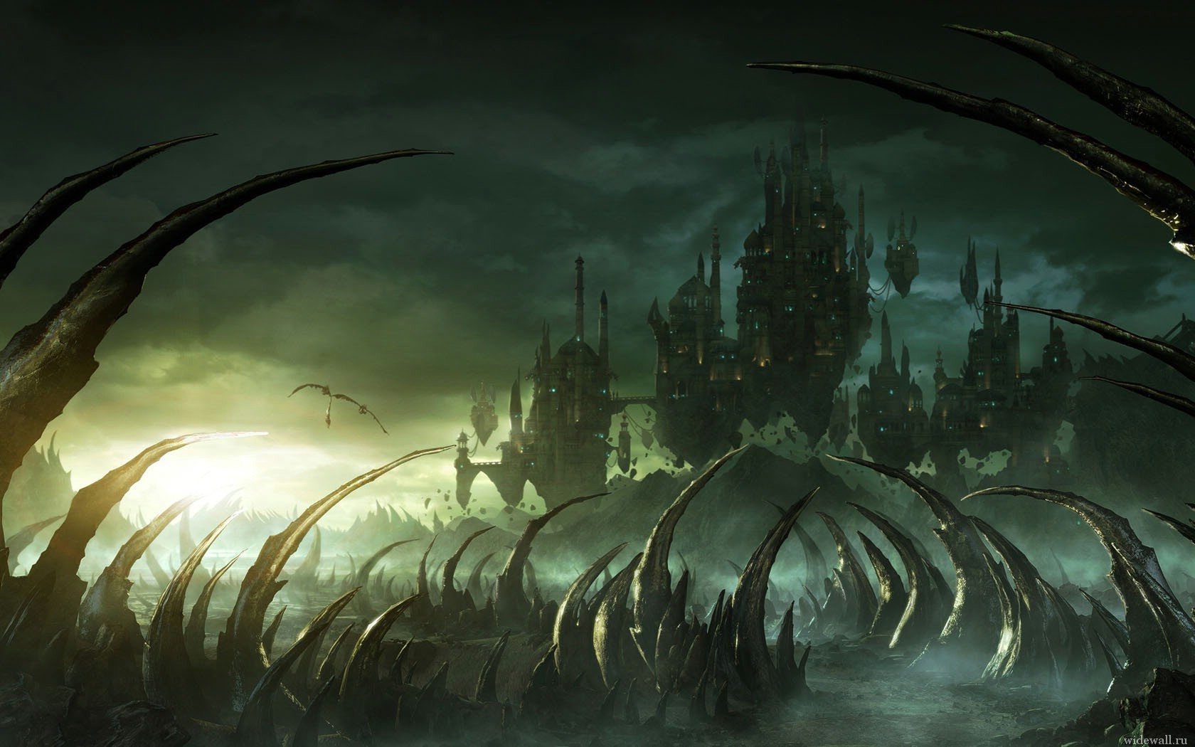 Castillo en las montañas con casas volando en el cieloCastillo en las montañas con casas volando en el cielo