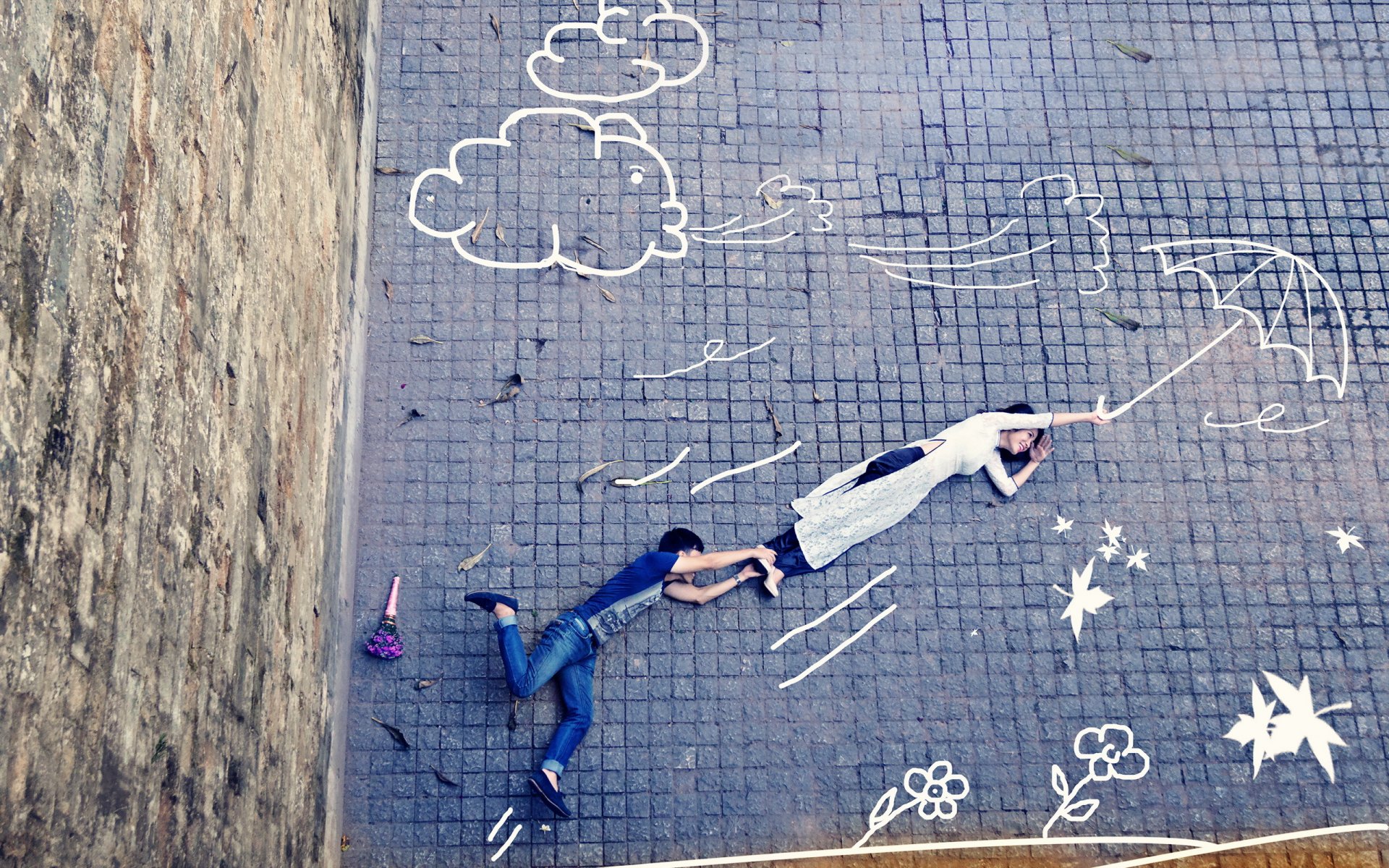 En el asfalto de tiza dibujado figuras que sostienen un chico y una chicaEn el asfalto de tiza dibujado figuras que sostienen un chico y una chica