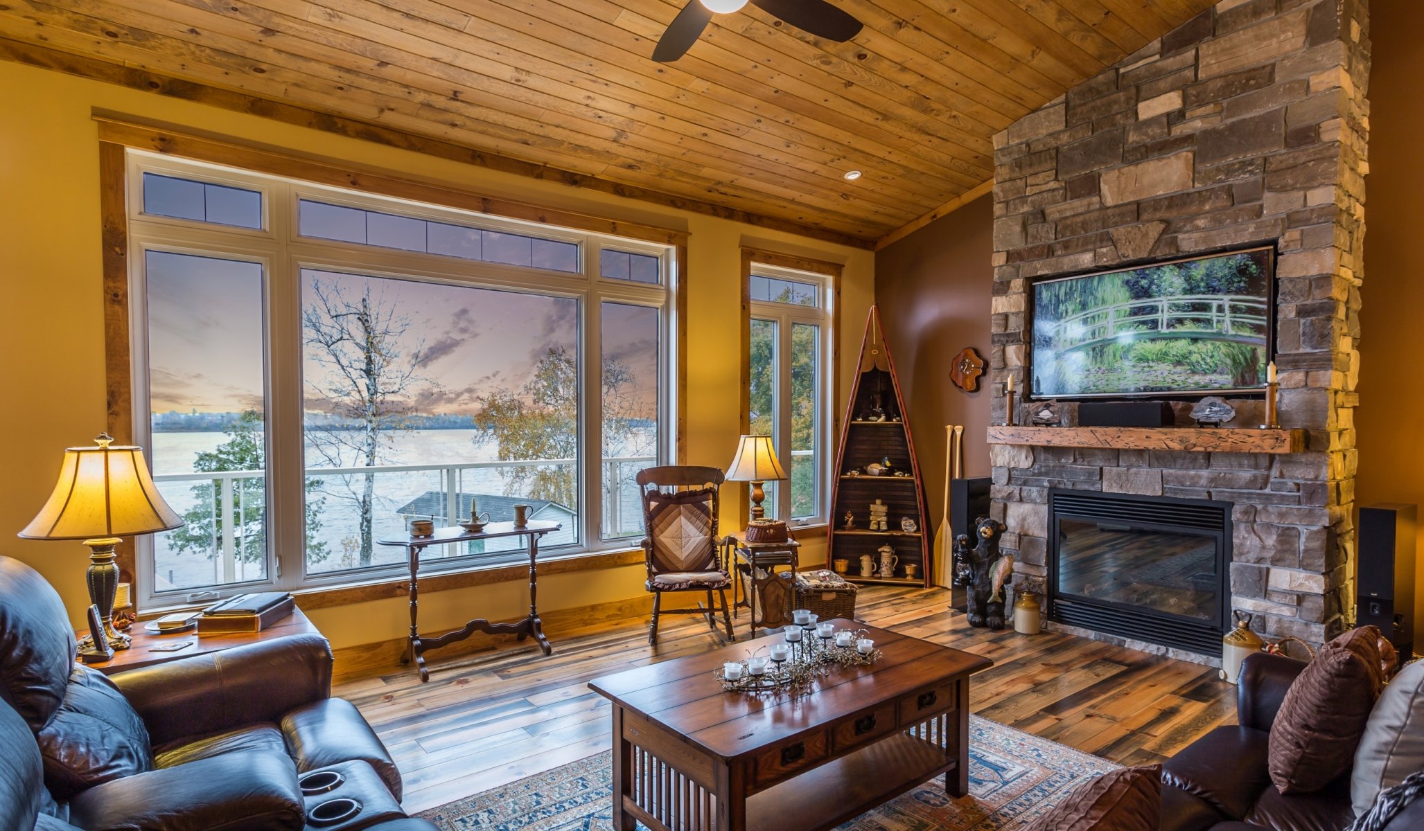 Acogedora habitación con chimenea y paisaje de montaña fuera de la ventanaAcogedora habitación con chimenea y paisaje de montaña fuera de la ventana