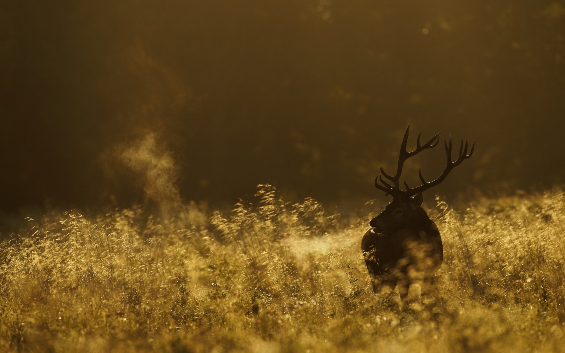 Ciervo junto al lago al atardecer en tonos naranjaCiervo junto al lago al atardecer en tonos naranja