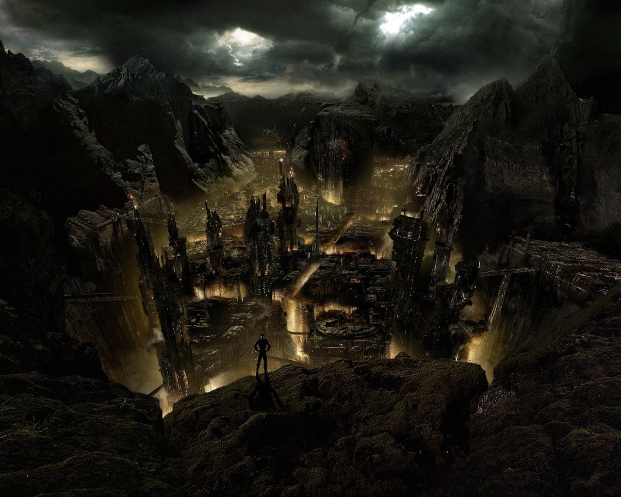 Hombre caminando por la ciudad de noche en las rocasHombre caminando por la ciudad de noche en las rocas
