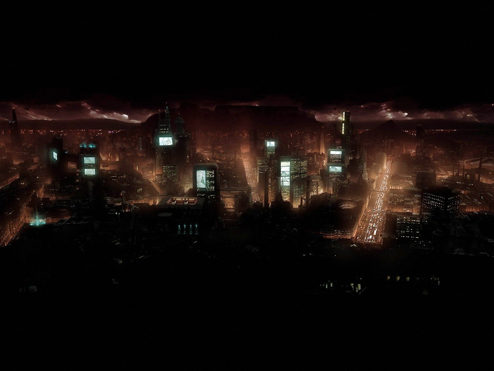 Puesta de sol en un planeta lejano en las luces de una ciudad lejanaPuesta de sol en un planeta lejano en las luces de una ciudad lejana