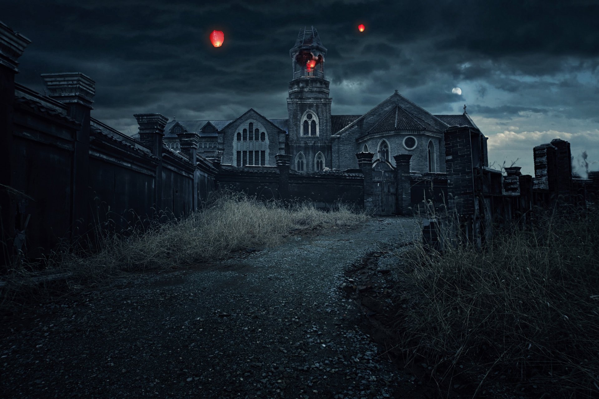 Foto del monasterio nocturno con linternas en el cieloFoto del monasterio nocturno con linternas en el cielo