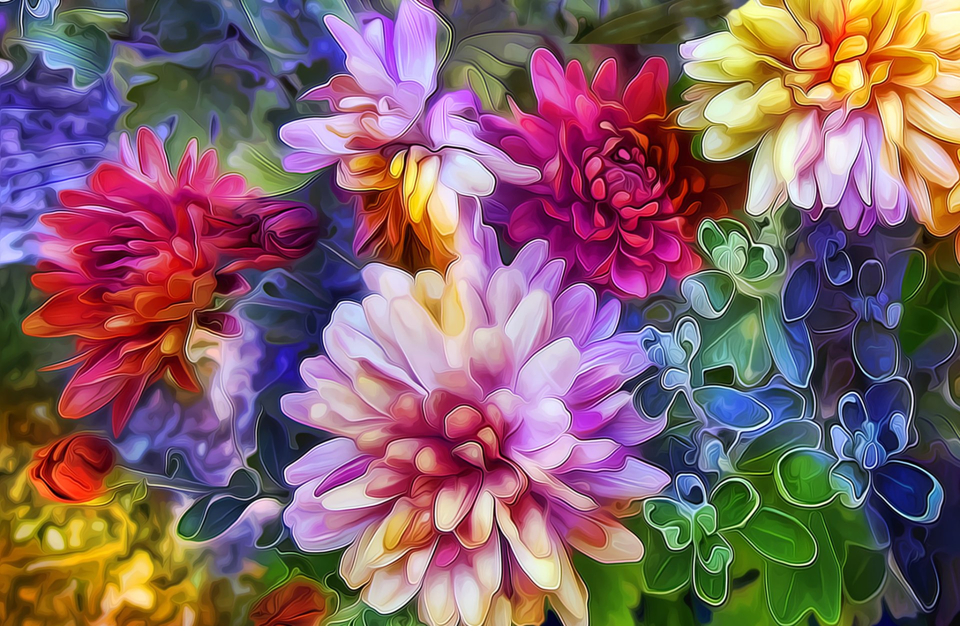 Pintura colorida colorida con flores de Aster