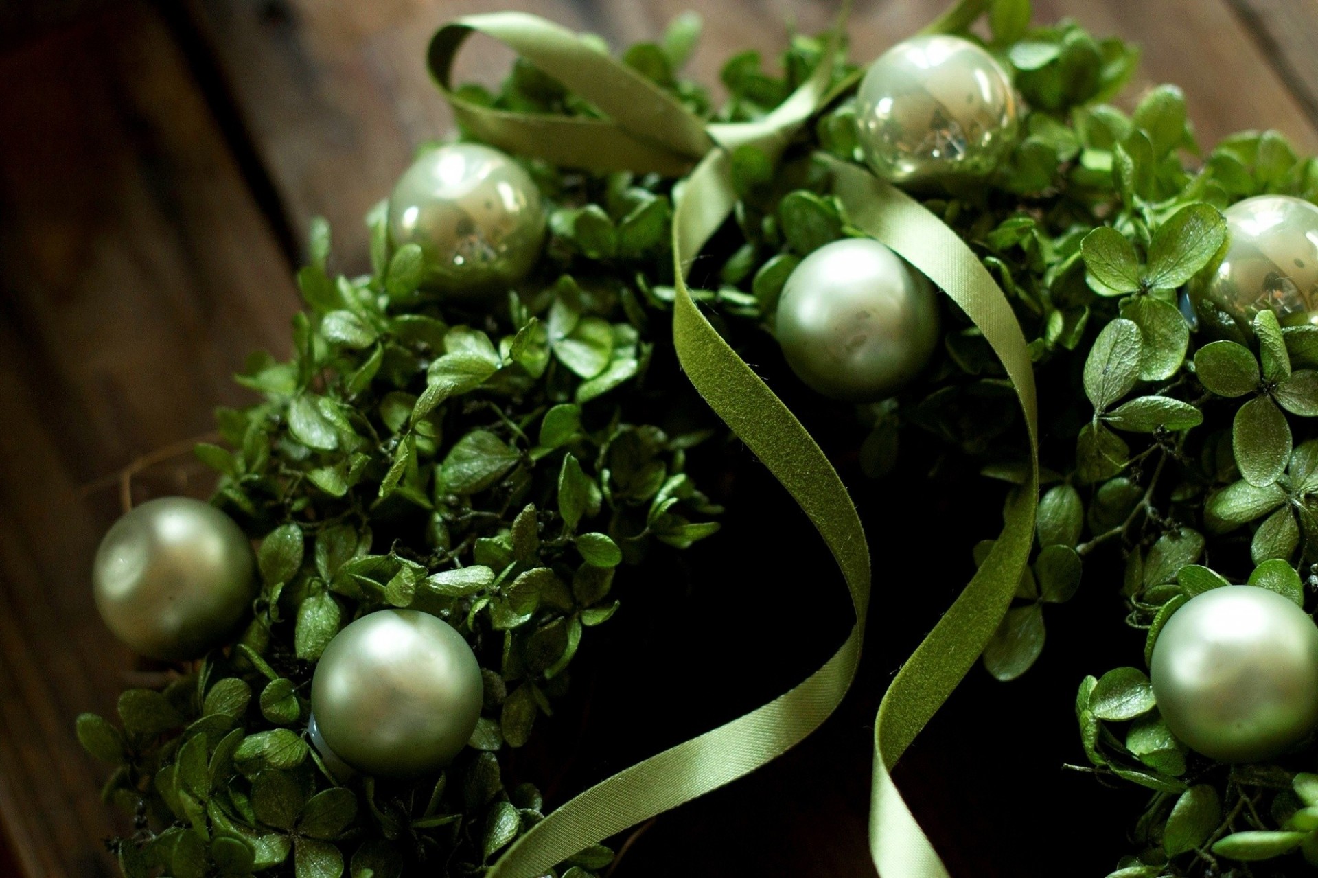 Bolas verdes con cintas en la corona de año nuevo