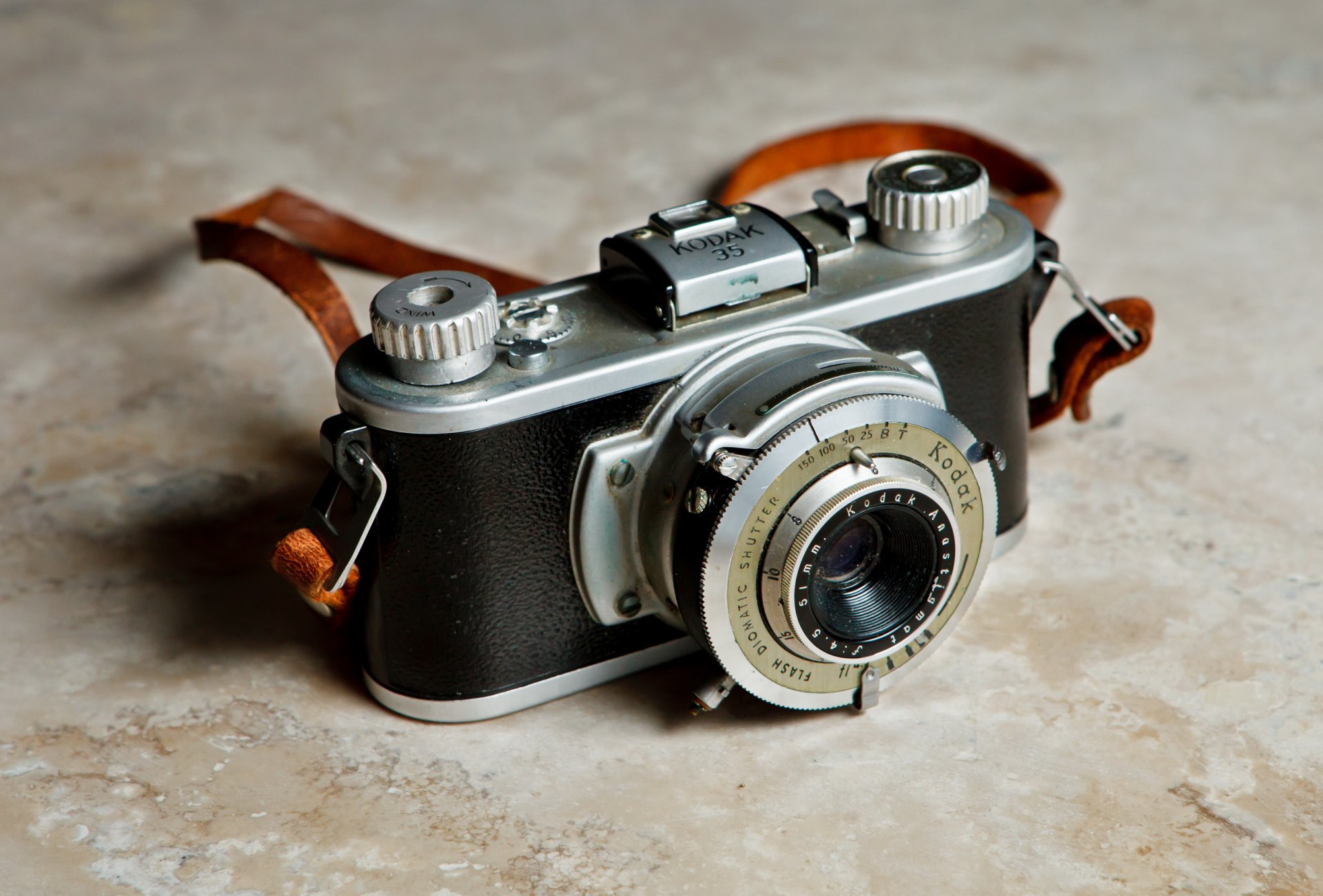 Cámara de sony en la mesa con correa vista superiorCámara de Sony en la mesa con correa vista superior