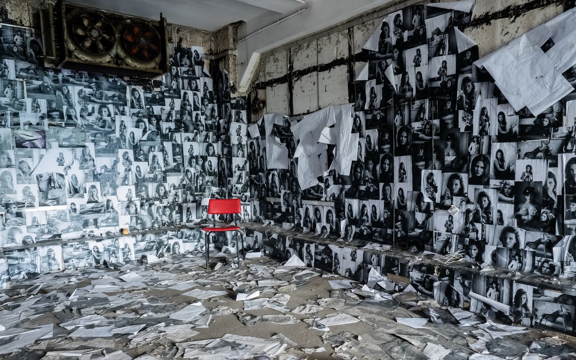 Habitación terminada con fotos y con una silla rojaHabitación terminada con fotos y con una silla roja