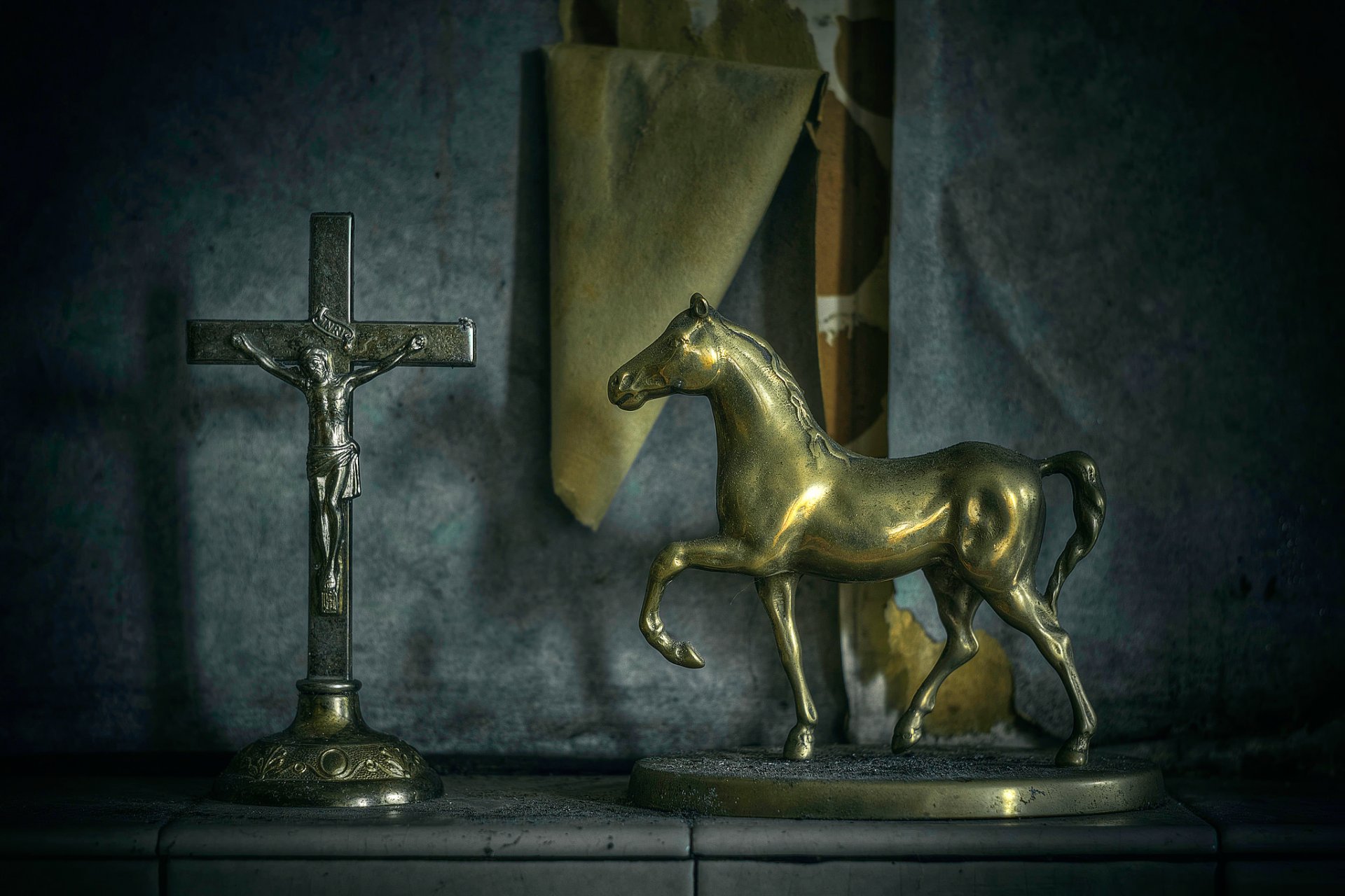 En el fondo del fondo de pantalla se alejó de la pared hay una estatuilla de un caballo y un crucifijoEn el fondo del fondo de pantalla se alejó de la pared hay una estatuilla de un caballo y un crucifijo